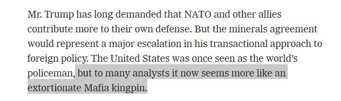 △《纽约时报》:美国现在更像是敲诈勒索的黑手党头目《纽约时报》更是形容,美国现在更像是敲诈勒索的黑手党头目。美乌矿产协议,“让人想起了殖民大国向殖民地索要贡品的情景”。乌克兰矿产资源 欧洲也想分一杯羹不过觊觎乌克兰矿产的还不止美国,欧盟也在24日提出一项新的协议,希望获取乌克兰资源。